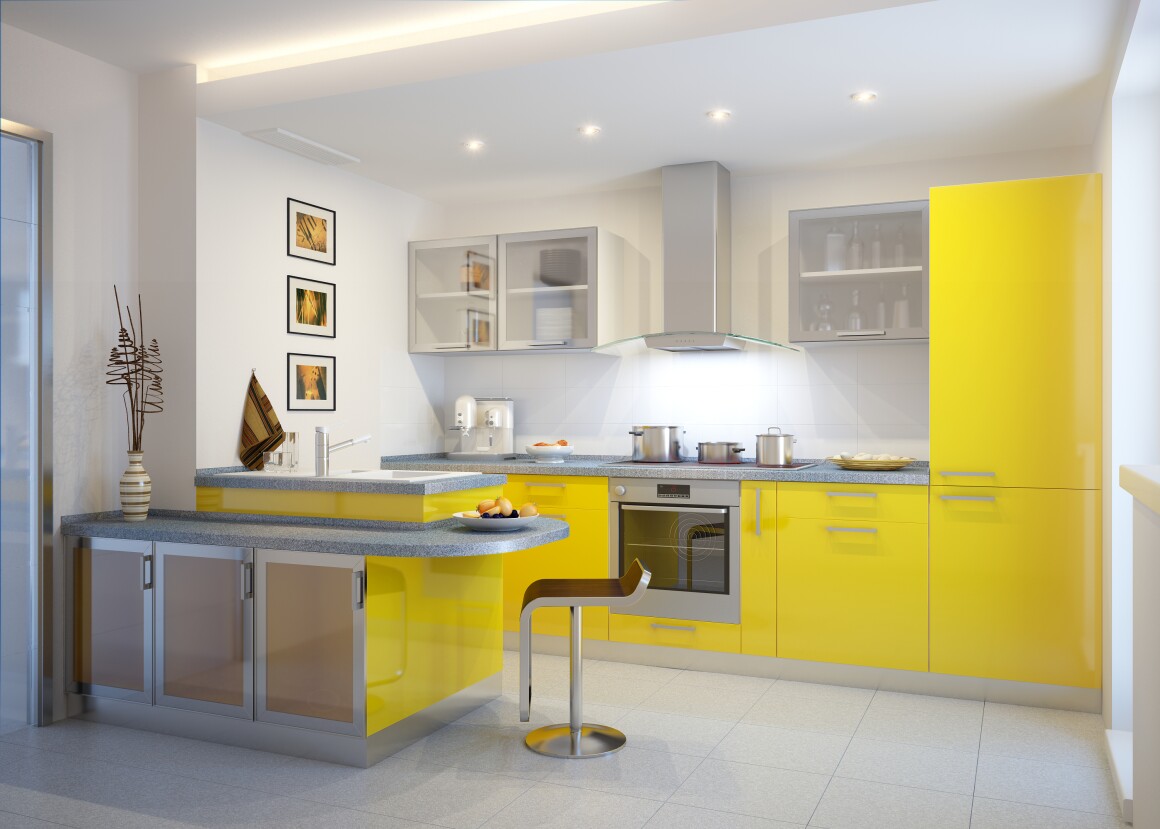 Жёлтая прямая кухня с островом